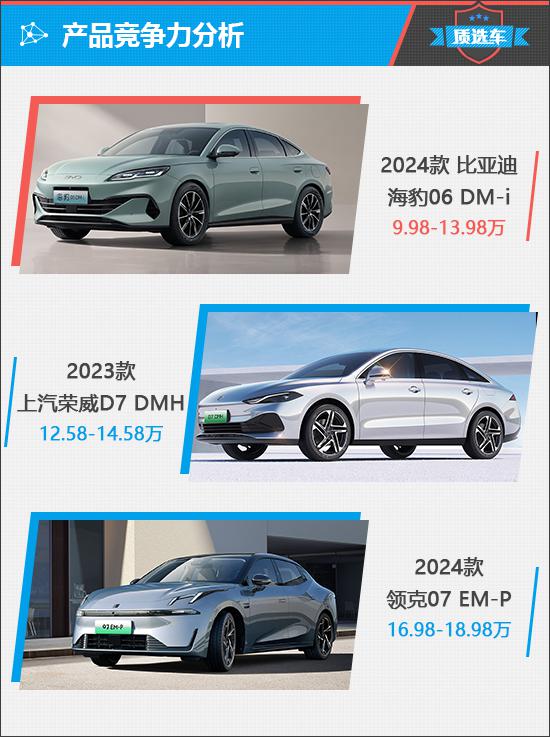 目前,国内插混中型车市场基本上是两极化的。一方面是以经济实惠为主的自有品牌;另一方面是以广汽本田雅阁新能源、上汽大众帕萨特新能源为主要阵营的合资品牌。由于大多数合资品牌插混车型的起售价格都超过了 20 一万元,所以这次我们选择了两款自主品牌车型和 2024 款 比亚迪海豹 06 DM-i(以下简称比亚迪海豹。 06 DM-i)进行对比,分别是 2023 款 上汽荣威 D7 DMH(以下简称荣威 D7 DMH)和 2024 款 领克 07 EM-P(以下简称领克 07 EM-P)。