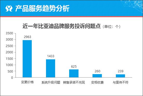 从服务投诉的角度来看,“价格变动”和“系统更新”已经成为车主对比亚迪品牌抱怨较多的服务问题。通过进一步分析,可以看出“价格变动”的服务问题主要集中在比亚迪汉和宋。 PLUS “系统更新问题”新能源车型主要集中在比亚迪宋 PLUS 新型能源汽车。
