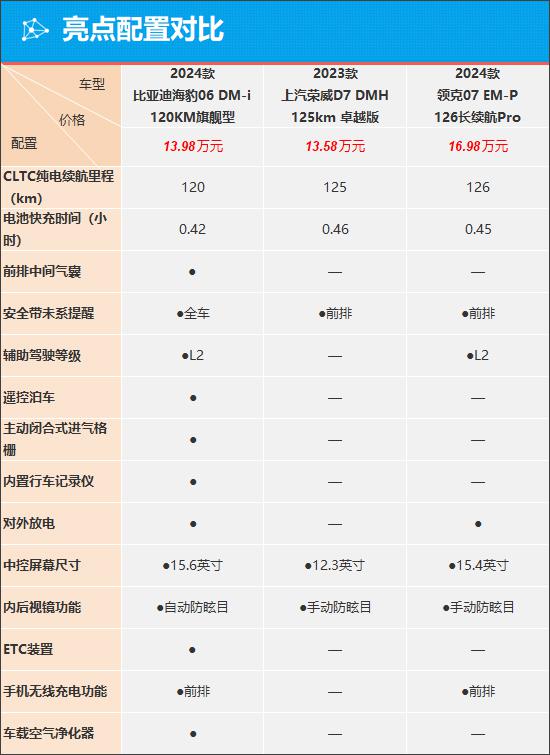就车型配置而言,从配置表的对比中不难看出,比亚迪海豹 06 DM-i 配置性能最全面。安全性方面,独享前排中间安全气囊,内置行车记录仪。就实用性而言,多了自动防眩眼内后视镜,ETC 设备等配置。相比之下,荣威 D7 DMH 在三款车型中,配置稍差一些,在智能辅助驾驶、实用配置等方面存在一些不足。