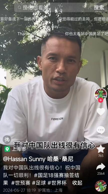 接着,哈桑,新加坡男足门将 · 桑尼在社交媒体上发布了一段视频,说:“我对中国队出线很有信心!祝愿中国队一切顺利!”