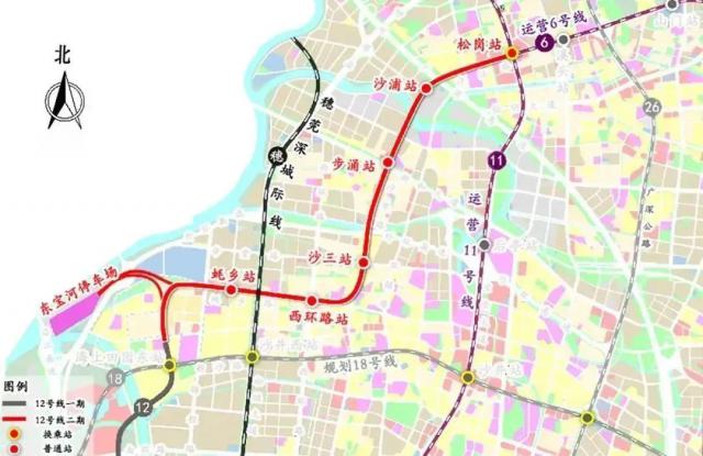 地铁 12 号线二期线路由 12 号线一期工程终点 � �海上田园东站 介绍,沿丰民路、牡蛎乡路、沙井路、沙江路铺设,最终到达 � �松岗站。