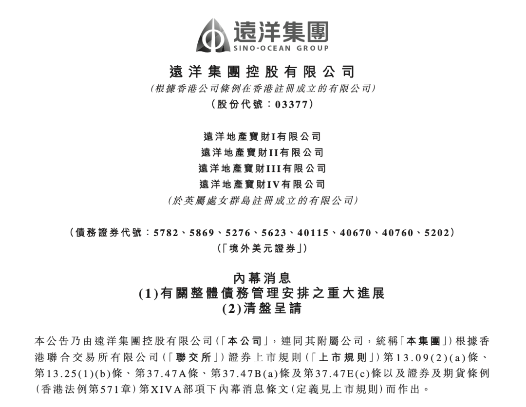 海洋集团在港交所宣布,对当前海外周转资金状况制定总体解决方案已取得重大进展。目前,公司与现有银团贷款协调委员会的讨论已进入后期阶段,预计总体债务管理安排的主要条款将在适度时达成协议。此外,收到美国纽约梅隆银行有限公司伦敦分行向香港特别行政区高等法院提出的清算请求,远洋地产宝财IV有限公司于2026年发行及担保到期3.25%的担保文件,涉及总成本4亿美元和应计利息。