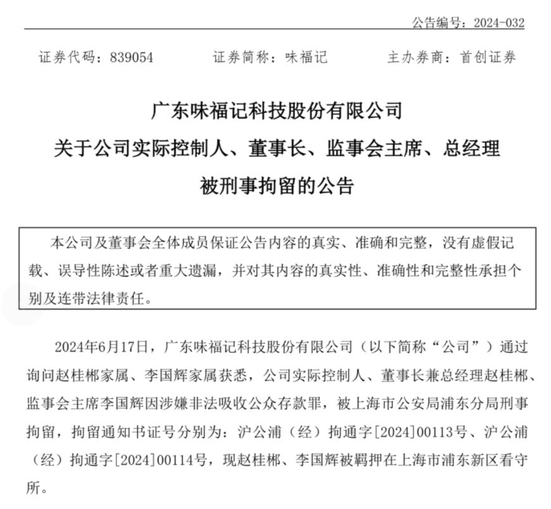 6月18日,新三板公司味福记宣布,广东省味福记科技有限公司(以下简称“公司”)通过询问赵桂郴家属和李国辉家属获悉,公司实际控制人、董事长兼总经理赵桂郴、监事会主席李国辉因非法吸收公众存款被上海市公安局浦东分局拘留。拘留通知书号码分别为:沪公浦(经)拘留通知书[2024]00113号,沪公浦(经)拘留通知书[2024]00114号,现赵桂郴、李国辉被拘留在上海市浦东新区看守所。