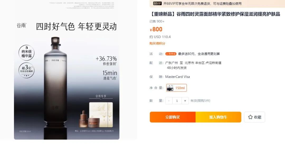 谷雨四十灵露精华水, 售价95 0元,折后800元 谷雨天猫旗舰店截图