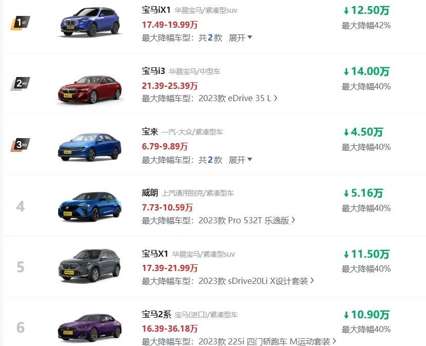 而且从平台总降价榜来看,宝马系列跌幅居前,多款车型最大跌幅超过40%。