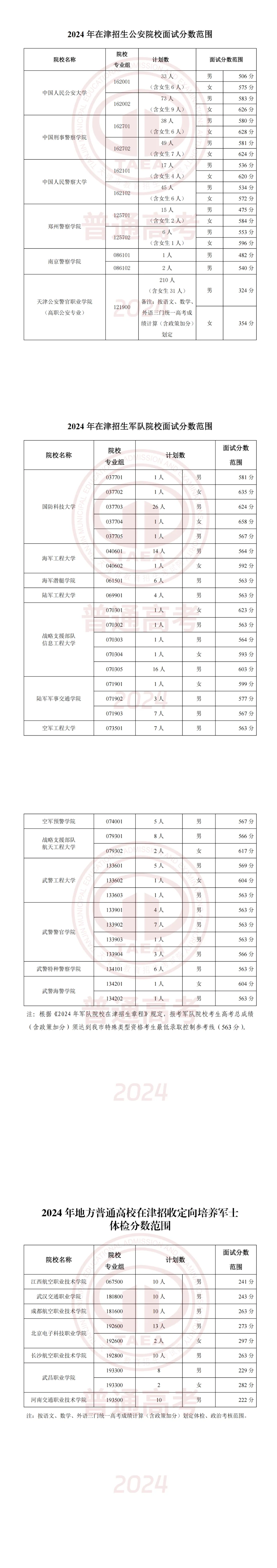 2024年在津招生的军事院校(含定向培养军士生)、面试、体检、体能评估成绩范围(包括天津公安警官职业学院)确定(具体成绩范围见附表)。