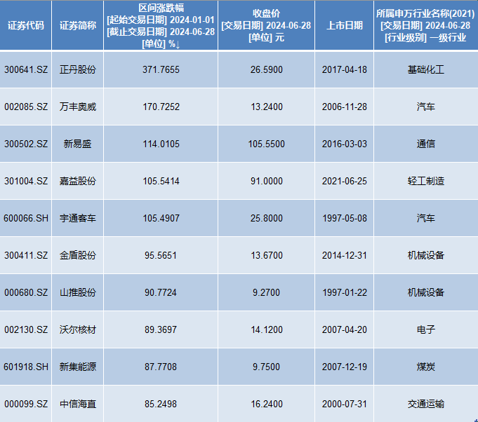 排名方面,去掉2024年上市的次新股后,正丹股份(300641)涨幅居首位,达到371.77%。