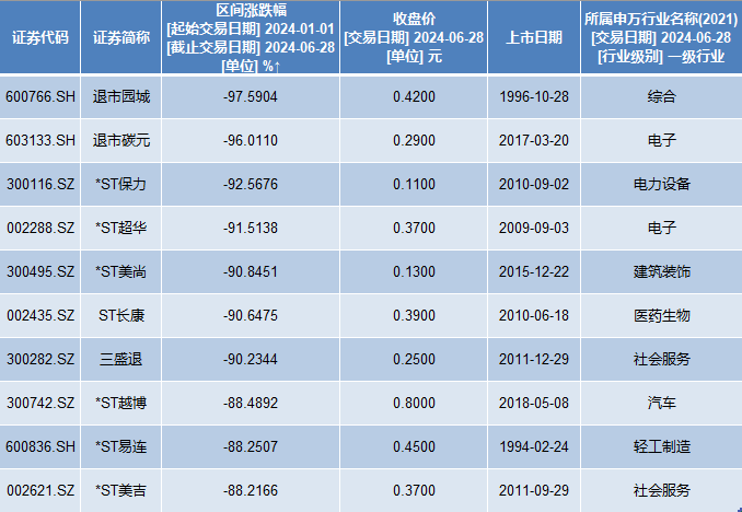 具体而言,退市园城(600766)领跌上半年a股市场,总数下跌97.59%。随之而来的是退市碳元(603133),上半年同样下跌90%以上,下跌96.01%。