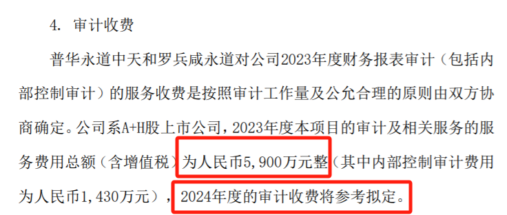 中国电信系A 对于H股上市公司,普华永道对其2023年度审计及相关服务费用(含增值税)的总额为5900万元,包括1430万元的内部控制审计费用。