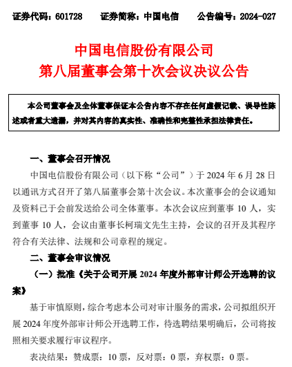 6月28日,中国电信召开董事会,以审慎原则为基础,充分考虑公司对审计服务的需求,审议批准了《关于公司2024年外部审计师公开选拔的议案》。