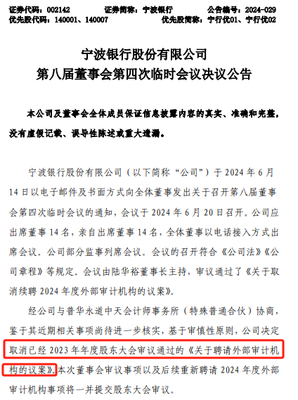 6月21日晚,宁波银行宣布,公司决定取消2023年年度股东大会审议通过的《关于聘用外部审计公司的议案》,鉴于普华永道近期相关事宜尚待进一步核实。