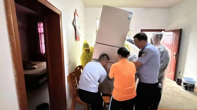 "叔叔,这儿地形太低了,水要淹到家里来了,我们帮你把冰箱搬到楼上去…"