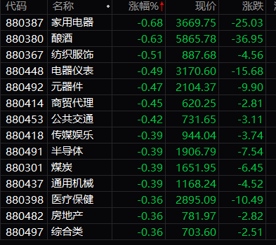 三大a股股指小幅低开,上证指数下跌0.19%,深证指数下跌0.39%,创业板指数下跌0.37%,家居、纺织、制酒、元器件、媒体娱乐、房地产、家电、煤炭、医疗等板块跌幅居前,但整体跌幅不大;石油、有色、日化、水务、银行等少数板块的红盘给出。
