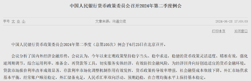 日前,2024年第二季度(总第105次)中国人民银行(以下简称“央行”)货币政策委员会在北京召开。与第一季度相比,本次会议继续提出“更加注重逆周期调整”和“加大已出台货币政策实施力度”,但更加注重股票政策的持续有效性,会议增加了“各种结构性货币政策工具的有效实施”、“着力推进已经出台的金融政策措施的实施”等表述。