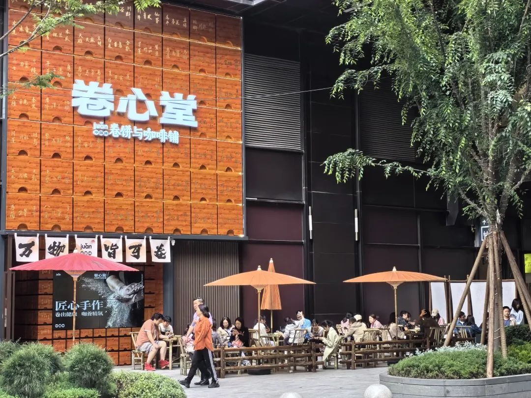 巨大的大门由56个“中药抽屉”组成,显眼地写着“卷心堂”。下面是“中国卷饼和咖啡店”,口号是“万物皆可卷”。
