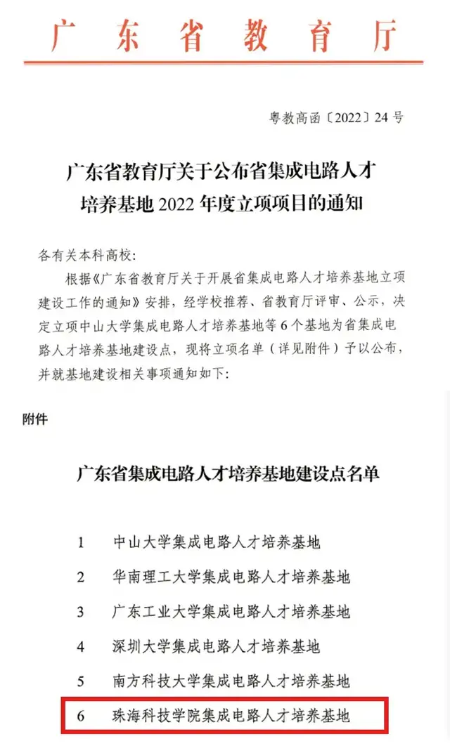 2022年,经广东省教育厅批准,经广东省集成电路人才培养基地批准,中山大学、华南理工大学、南方科技大学、深圳大学、广东工业大学、珠海科技学院6所高校批准。