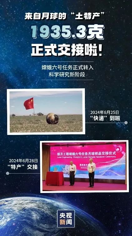 六月二十八日,国家航天局在京举行月球样品交接仪式,探月工程嫦娥六号任务。经初步测量,嫦娥六号任务采集月球样品1935.3克。