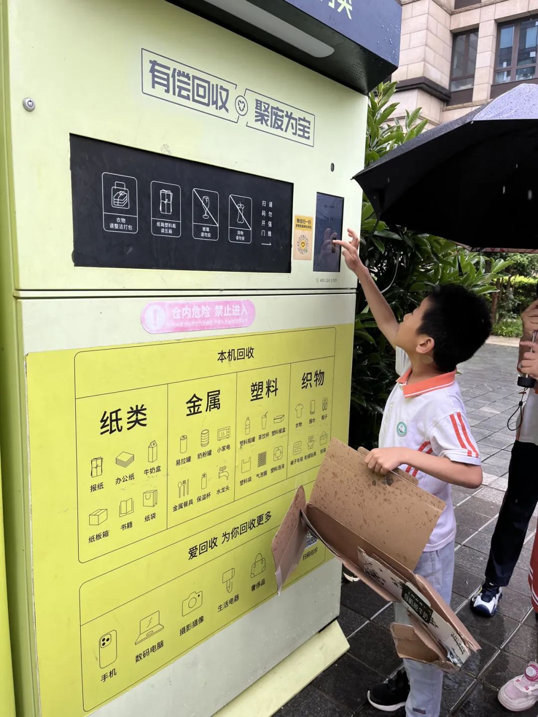 在参观过程中,老师和学生首先来到了“爱回收爱分类”的智能回收机点。在工作人员的指导下,学生们亲自操作了智能回收机,并将废物投入到相应的回收口。快速识别机器,自动称重,并给予相应的积分奖励。这种新奇的感觉让学生们兴奋不已。他们都说智能回收机不仅操作简单,而且可以立即给出反馈,让他们真正感受到垃圾分类和回收的快乐和意义。