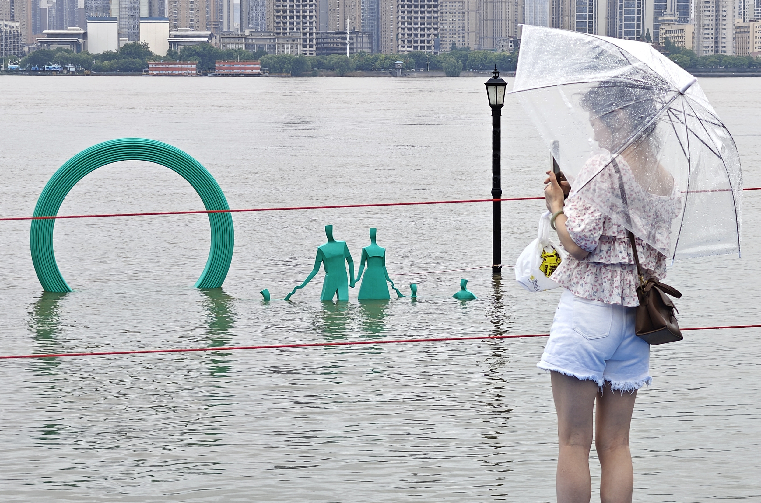 一位市民于2024年6月28日拍摄了湖北武汉汉口江滩上被淹的“一家五口”雕塑。 视觉中国 图