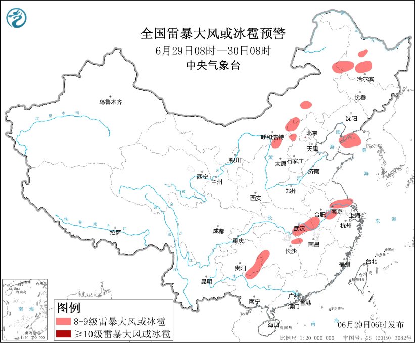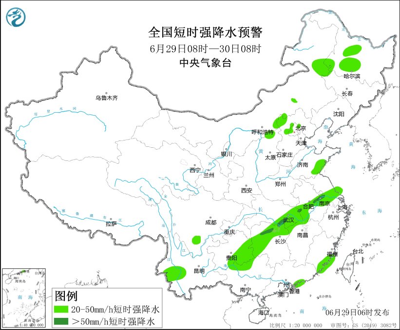 预计6月29日08时至30日08时,内蒙古中东部、黑龙江西南部、辽宁南部、山西北部、河北中北部、安徽中南部、江苏中南部、湖北东部、湖南西部、北部、贵州东南部、广西北部等部分地区将有8级以上的雷暴或冰雹天气。最大风力可达10级以上;内蒙古中东部、黑龙江西南部、山西北部、河北中北部、北京西南部、山东中南部、安徽中南部、江苏中南部、湖北东部和南部、湖南中西部和北部、江西北部、福建东南部、四川南部、贵州中东部、广西北部等部分地区将出现小时雨量超过20毫米的短期强降水天气,其中,在一些地区,如安徽中间、江苏南部、湖北东部和南部、湖南北部和西部,将有小时雨量超过50毫米,最大可达80毫米。