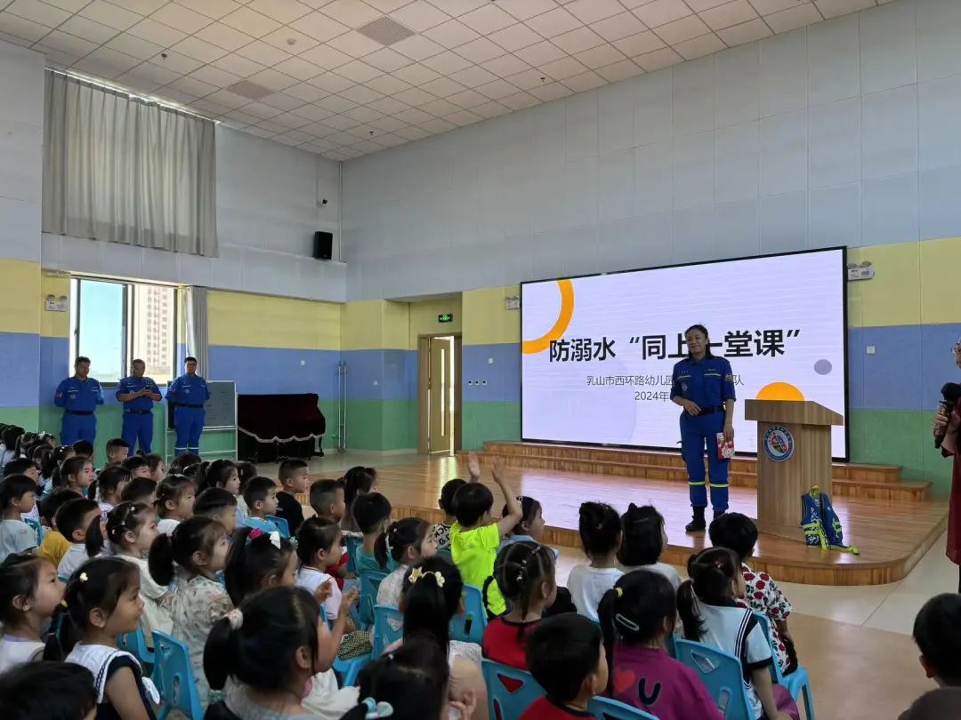 乳山市西环路幼儿园邀请市蓝天救援队进入校园,开展“同上一堂课” 安全教育活动,携手防溺水。