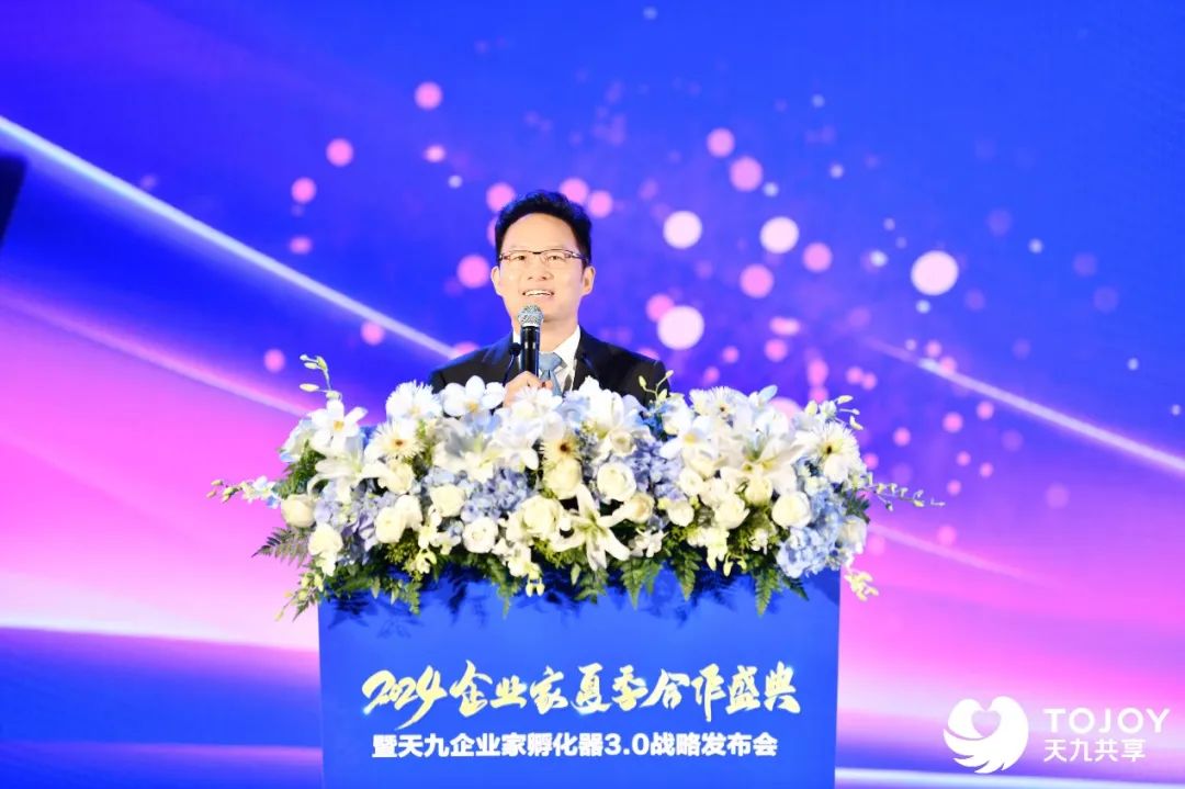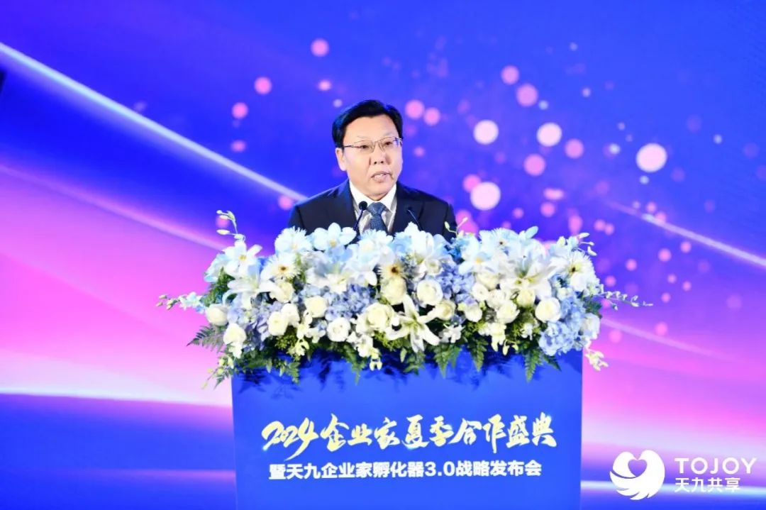 中国商业联合会执行会长兼秘书长王民在开幕致辞中表示,合作是发展之源、共赢之基,许多传统企业家通过平台找到转型路径,也有很多创新型的新经济企业通过平台赋能,实现加速发展,同时为社会创造新的价值。当“新质生产力”在神州大地掀起新浪潮时,创新企业与传统企业的合作将迎来全新的局面、共赢的春天,期待天九企业家孵化器能为民企创造更大的价值。