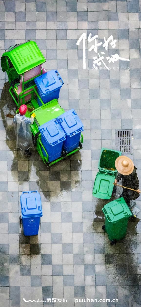 江城“积木”在雨中连日暴雨,环卫工人冒雨清扫。 城市摄影队 蓝江桥 在黄浦大街上拍摄
