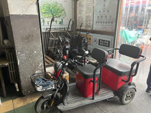 隐患:电动三轮车停放在市场大厅安全出口处(立即整改)