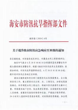 6月30日00时10分,海安气象台将暴雨蓝色预警信号升级为暴雨黄色预警信号。根据《海安市防汛抗旱应急计划》,经综合判断,市防汛抗旱指挥部决定从6月30日01时00分开始,提高我市防汛应急响应。Ⅲ级。