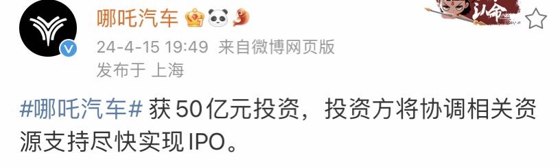 四月十五日,哪吒汽车在其官方微博上宣布投资50亿元,投资者将协调相关资源,尽快实现IPO。