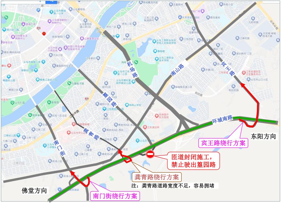 2024年7月3日至8月31日,由于S217萧山至磐安公路义乌江东至赤岸公路工程(稠佛二线)的施工需要,将全封闭开挖环城南路向东阳出口坡道。请提前从环城南门街出口出口,绕道至南山路,或沿环城南路继续前进至宾王路出口出口,然后绕道至南山路。通过这个出口到南山路的车辆。