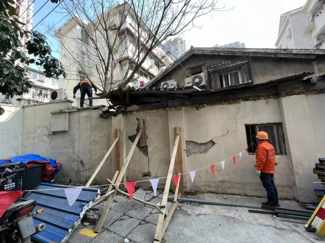 民生不是小事。为了切实为人民服务的“最后一公里”,瞿西居委会迅速付诸行动,联合物业企业临时支持危险墙,并安排专人进行日常检查,确保居民生命财产安全。但是暂时的支持措施并不是长期的计划。如果想要完全消除安全隐患,就必须移植造成墙体损坏的树木。但是,这个看似简单的方案却面临着巨大的阻力。原来这棵树的生长位置正好在打浦路500弄公弄通道。这条通道封闭,空间狭小。由于历史遗留问题,仍然存在违法建筑。五里桥街道了解情况后,立即将此事纳入“动真碰硬破难题” 在专项行动计划中,用心用情为居民解决难题,努力工作,谋求发展。
