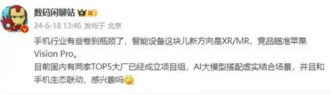 上面列出的AR/VR商品在成本和市场接受度的多重考虑下,在实际体验上都与Vision有关。 Pro差距很大。然而,距离Vision很远。 根据一位知情人士的说法,Pro的真实平替出现可能并不遥远,国内至少有两家TOP5级别的手机制造商,他们正在建立一个XR/MR团队,他们投入的资源超过了以前的类似项目。