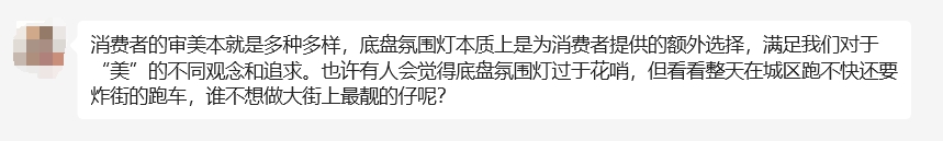 在小通看来,小米汽车在汽车市场的知名度还没有达到传统奢侈品牌的高度。但是小米SU7可以通过迎合小众的个人需求,不断为品牌吸引粉丝。也许在这个过程中,有“鬼火少年”的吐槽,但对于小米汽车来说,智能底盘氛围灯只是一个小小的官方配件,类似的吐槽对品牌的影响几乎可以忽略不计,可以说是无害的。