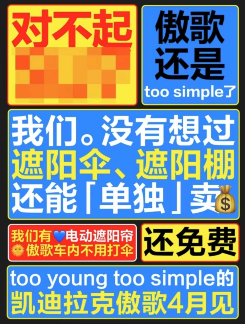 我还记得凯迪拉克用一组“椰子汁”风格的海报嘲讽小米SU7,包括提到“我们从来没有想过太阳伞和遮阳篷还能「独立」卖掉它,最后还顺便夸夸自己的傲歌,有免费的电动遮阳帘。