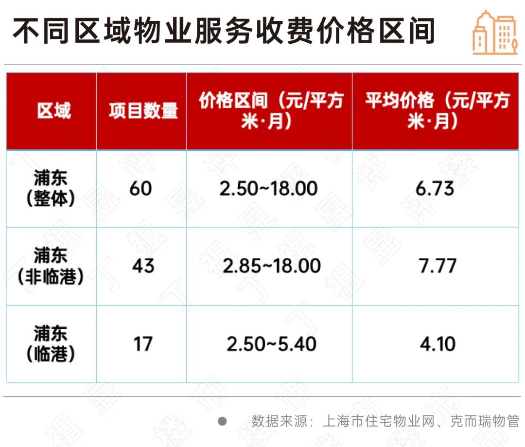 浦东的情况也差不多。对于60个新入市项目,非临港地区的物业费最高可达18.00元/平方米月,最低可达2.85元/平方米月。临港地区略“柔和”,最高可达5.40元,最低可达2.50元/平方米月。这种价格波动比股市更令人兴奋。