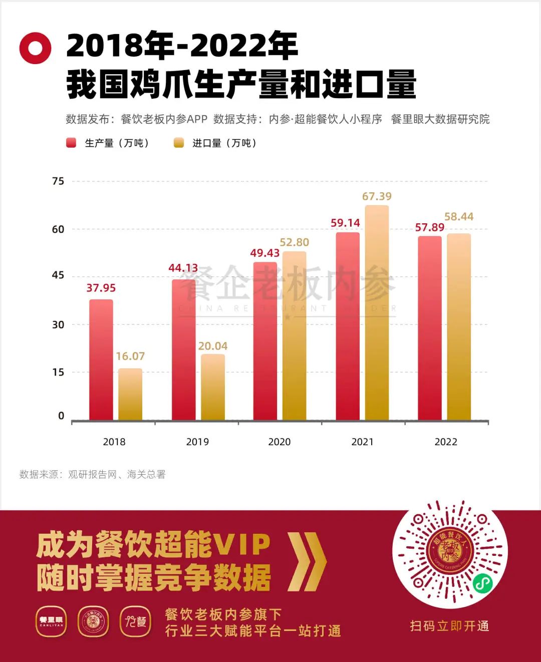 根据观察报告网,2022年我国鸡爪产量为57.89万吨,较2021年下降2.11%。同一年,从国外进口的鸡爪也从67.39万吨下降到58.44万吨。鸡爪的产量和进口量呈下降趋势。