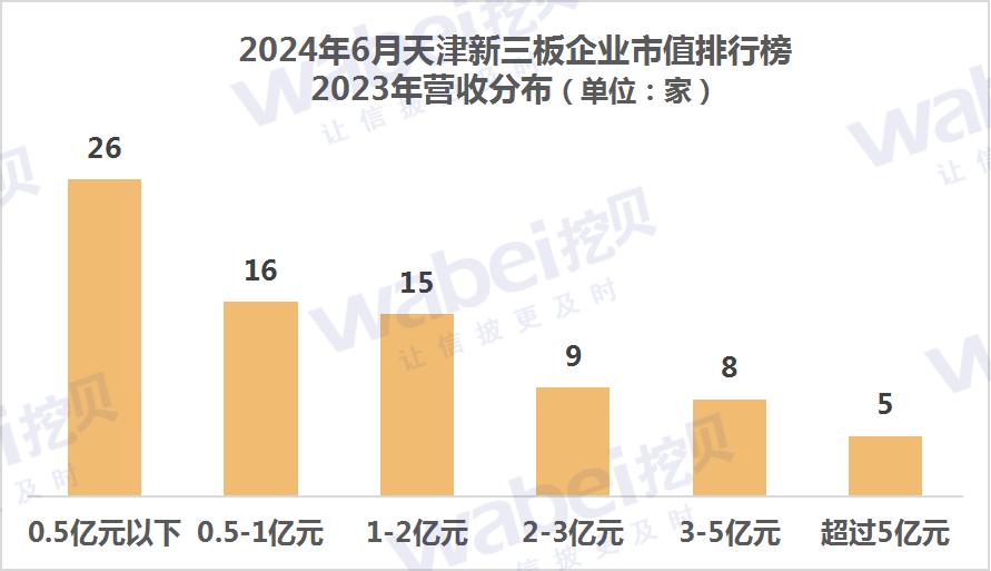 根据2023年上市公司营业收入分布的特点,榜单中有5家企业营收超过5亿元,去年8家企业营收超过3-5亿元,分别为9家、15家、16家,营收超过2-3亿元、1-2亿元、0.5-1亿元,26家企业2023年营收低于0.5亿元。