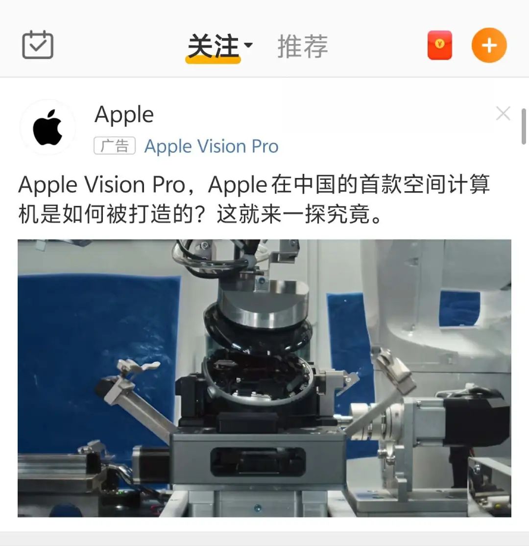 但是,总的来说,这些小问题并没有影响。 Vision Pro 第一次销售的整体宣传节奏:苹果使用超过 iPhone 为中国客户推荐这款新产品发布规格。「划时代新品」:不管是小红书,B 或者微博,这些主要社交媒体的开屏都可以看到和看到。 Vision Pro 相关广告内容,并在首日上市,同时,苹果还邀请了像杜海涛、佘诗曼这样的演艺明星出席。