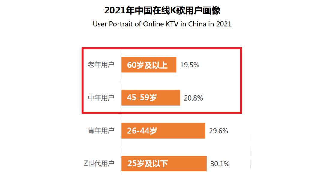 根据艾媒咨询数据,中老年客户(45岁及以上)比例为40.3%,在2021年我国在线k歌用户画像中,比年轻一代客户略高。