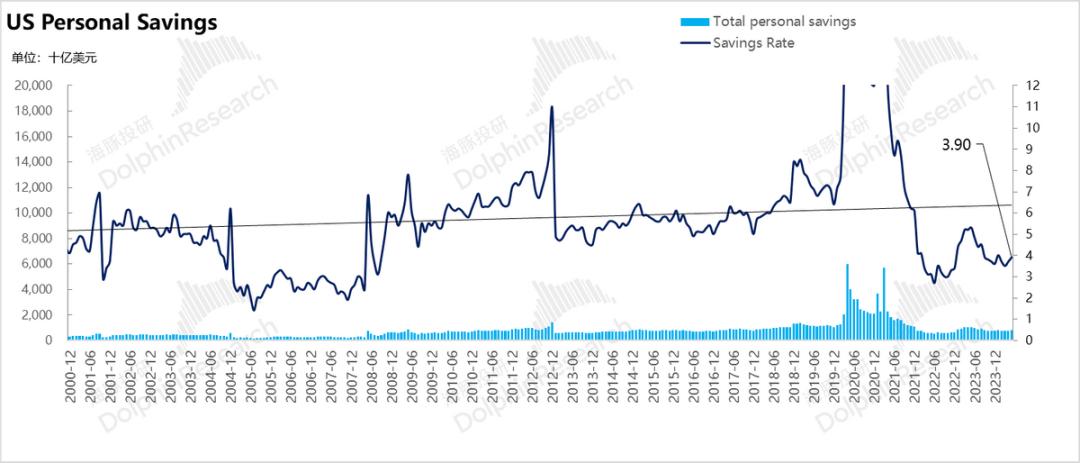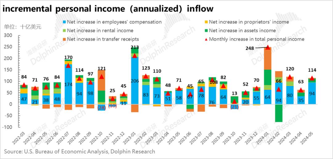 但这里需要注意的是,居民连续两个月消费疲软,本质上是储蓄率的回收,自己名义上总收入的增长率,高就业高薪。 在资产膨胀/高分红的推动下,薪酬和资产收入的增长率仍然可以接受,短期内没有开源问题。