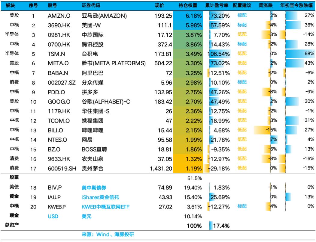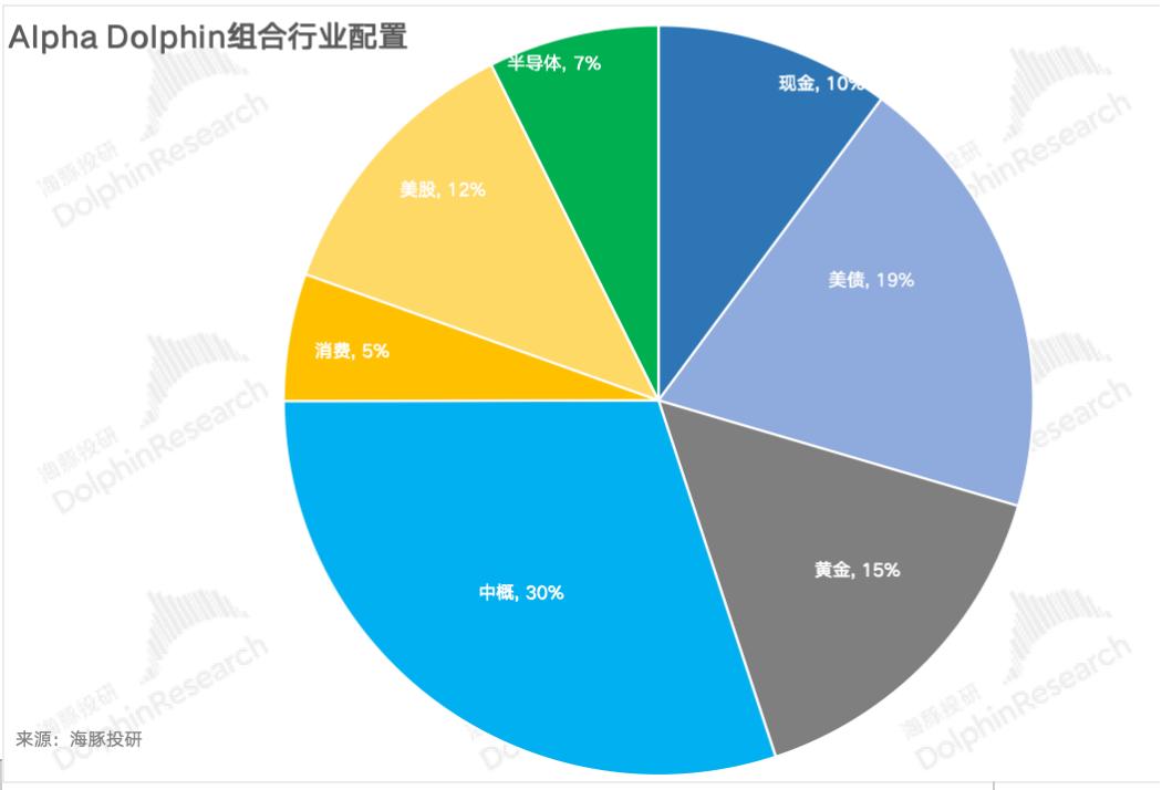 Alpha Dolphin虚拟组合共持有20只股票和股权ETF,其中5只为标准,其他股权资产为低配,其余为黄金、美债和美元现金。