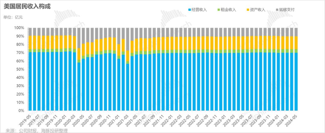 e. 转移收入,这里主要是个人从政府那里获得的二次分配收入,如社会保障(低保、医疗保险、养老金), 工作 还有退役士兵的福利等。),但是需要注意的是,这个数字是净值,因为居民作为一个整体,也需要向政府支付社保。目前社保缴纳后,居民整体转移收入一直为正,占总收入的10%左右,排名第三。