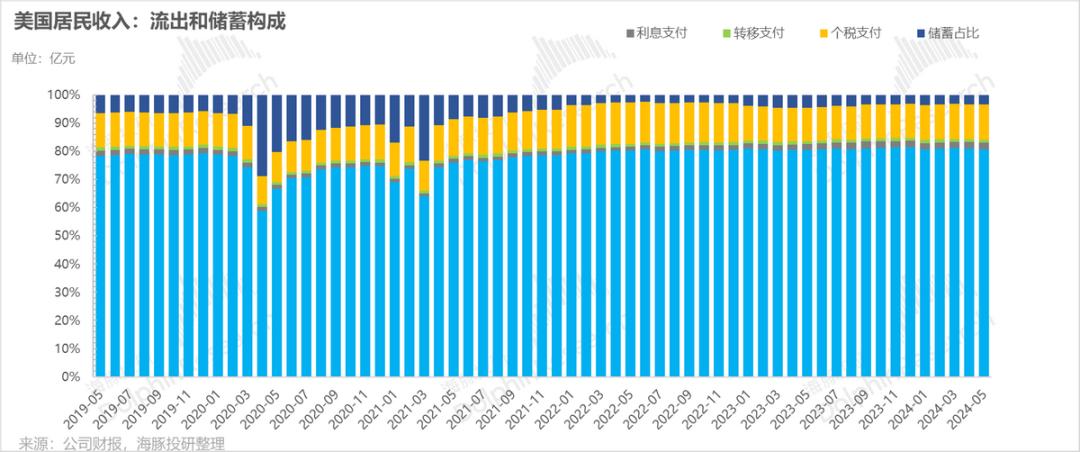 从5月份的数据来看,从美国新增名义收入的流出方向来看,居民消费确实较弱,主要原因是流向储蓄额度的增加,挤压了原有的流向消费支出,这种情况已经持续了两个月,直到5月份。相应地,居民储蓄率上升,消费比例略有下降。