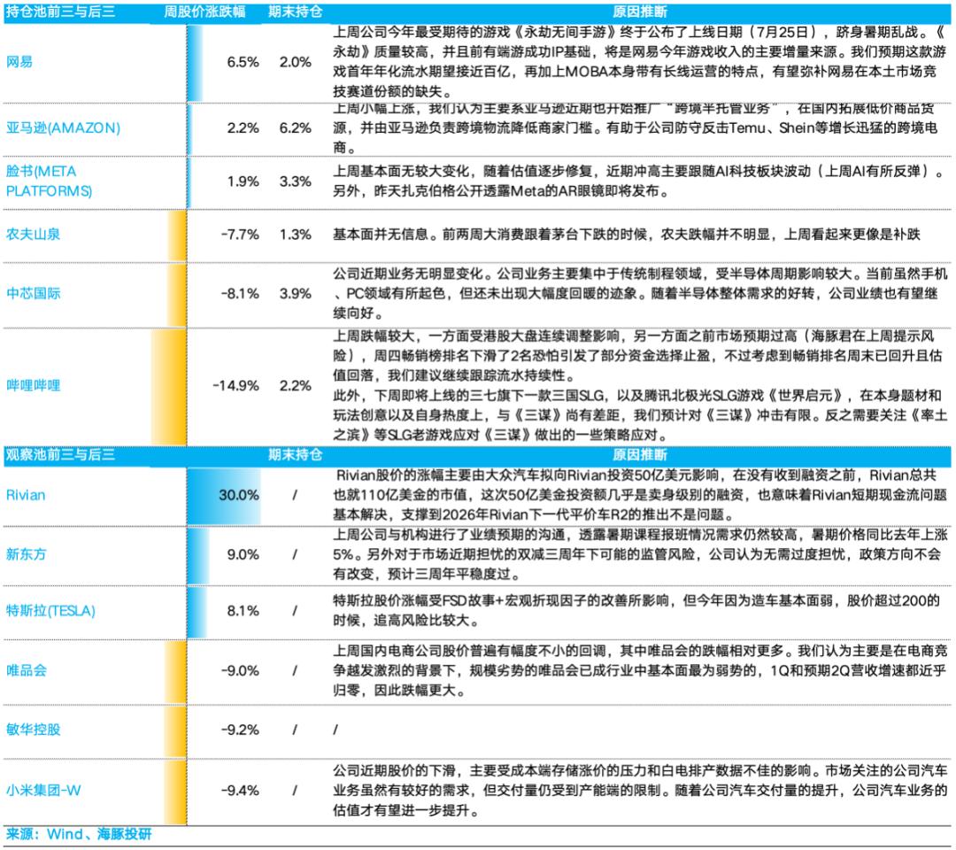 上周主要依靠网易和亚马逊,但这两者的具体涨幅并不高。然而,前一周大幅上涨的哔哩哔哩又跌回来了。虽然上周海豚君提示了风险,但海豚君并没有做出调整,因为哔哩哔哩的仓位并不重,后续的灵活性还是要及时跟踪《三国谋定世界》的流水情况。