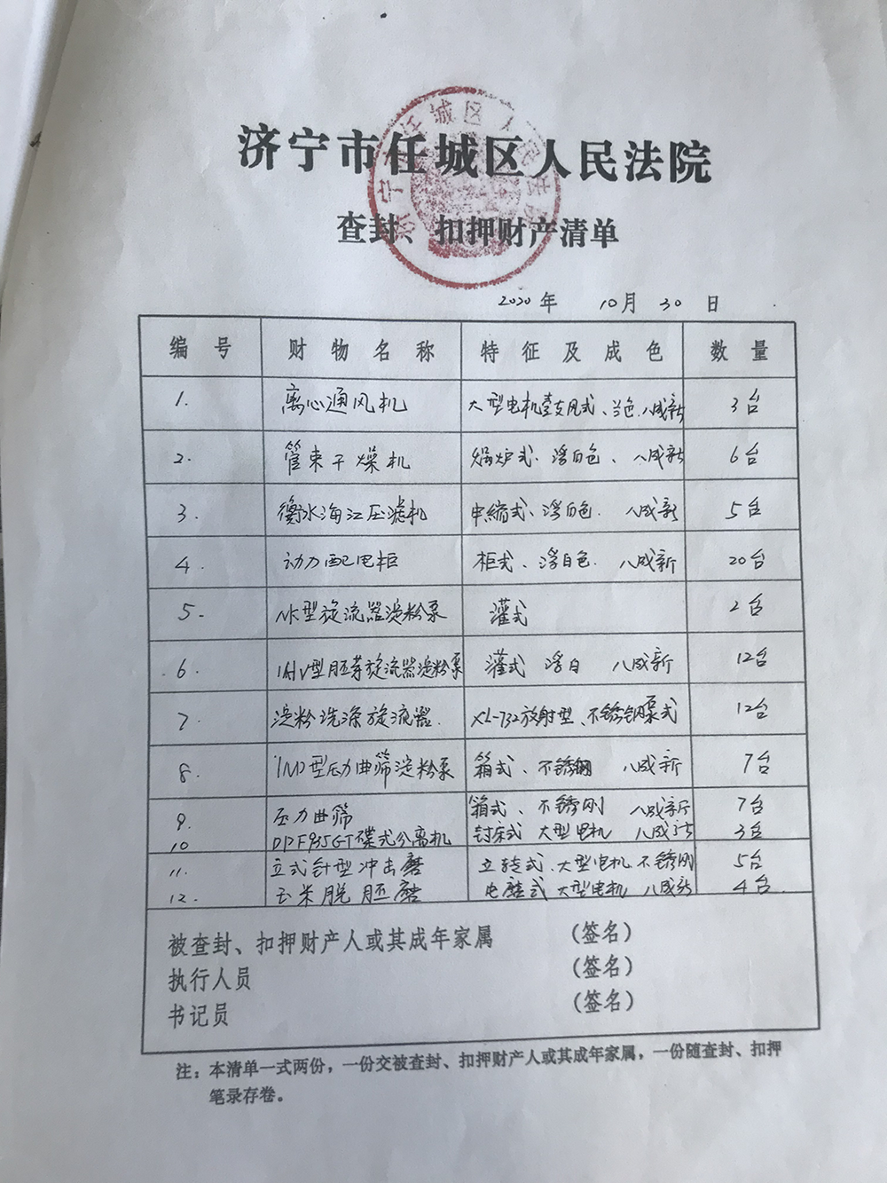 根据2020年10月30日任城区法院发布的《财产查封扣押清单》,该院查封了3台离心风机、5台压滤机、6台管束干燥机、20台动力配电柜、12台胎芽旋流器淀粉泵等86台机械设备,均为“80%新”。