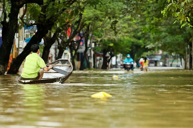 一场暴雨过后,一名越南男子用船在水面上行驶。(图/视觉中国)