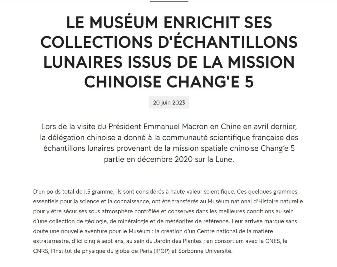 2023年4月,法国总统马克龙访华时,中国向法国赠送了1.5克嫦娥五号采集的科学月球样品,随后,该样品被收藏在法国自然历史博物馆。根据2023年6月20日法国博物馆的声明,“未来5-7年,我们将与法国国家航天研究中心合作。(CNES)、法国国家科学研究中心(CNRS)、巴黎地球物理研究所(IPGP)与巴黎索邦大学联合研究这份赠送样品。”