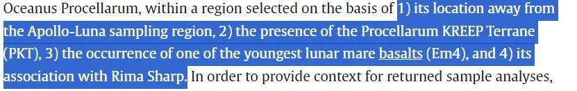 爱思唯尔(Elsevier,2021年2月,该公司发行了《柳叶刀》等权威期刊)的《地球与行星科学快报》。一项研究指出,嫦娥五号着陆区有四个特点:“远离阿波罗规划的月球取样区,有风暴洋克里普地体,夏普月溪周边有最年轻的月海玄武岩之一”。由于其含量高,风暴洋克里普地体已成为月球上大多数表面较为特殊的地区,具有较高的研究价值。