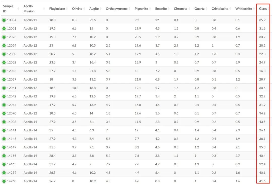 由美国国家航空航天局资助的月球和行星研究所整理的阿波罗计划的所有月球样本的一般成分图表。截图显示,玻璃在不同的样本中有一定的比例。